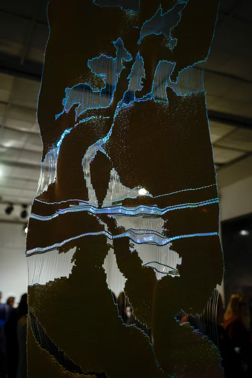 Confessions Of A Joy Seeker is composed of seven weavings, or confessions, with a video playing over the space. As a whole, this work is the tension I feel between Heaven and earth. Each confession is a facet of where I see, and where I seek to find joy. Through the video you see the sun, slowly rising, reflected in a body of water.