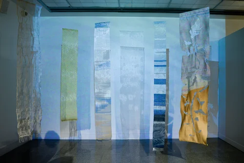 Color Play 2 came out of a season of being fascinated by the quality and materiality of silk organza and silk gauze; the way they moved and the way they could layer together to build color. This piece is composed of six naturally dyed, silk gauze scrims, a series of color studies along the wall, and video played overtop; showing a figure skipping rocks.