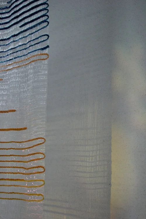 Threads is 14” wide and 7’ long. It is like the acknowledgment page at the back of a book where the author thanks everybody who helped in writing the book. Except this is not a book. It is a weaving. It is woven with found yarn, gifted yarn, naturally dyed yarn, and monofilament woven using inlay on plain weave.