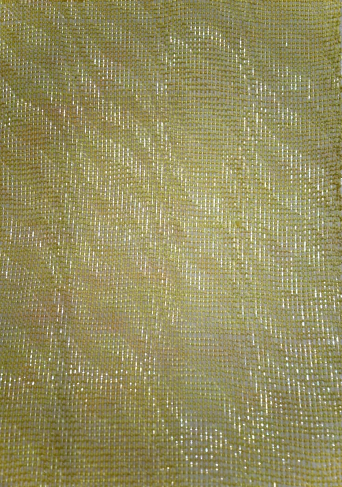 This piece is 13” wide and 7’ long. It is woven with shadow weave using monofilament and yarn dyed with goldenrod: a bright yellow flower
